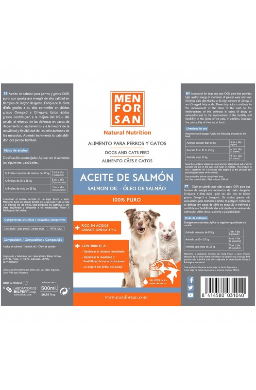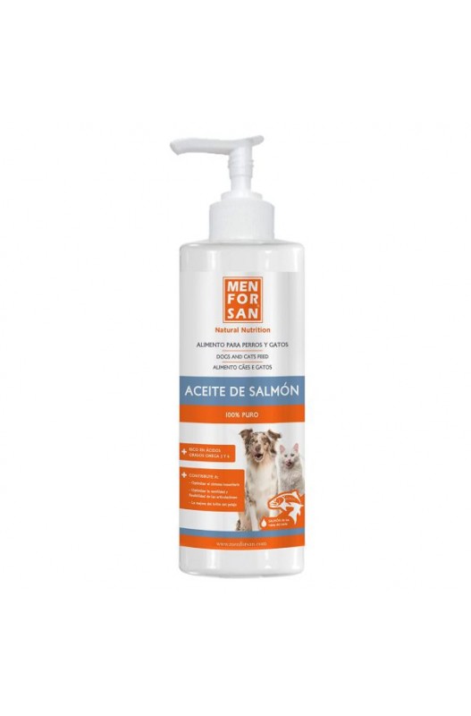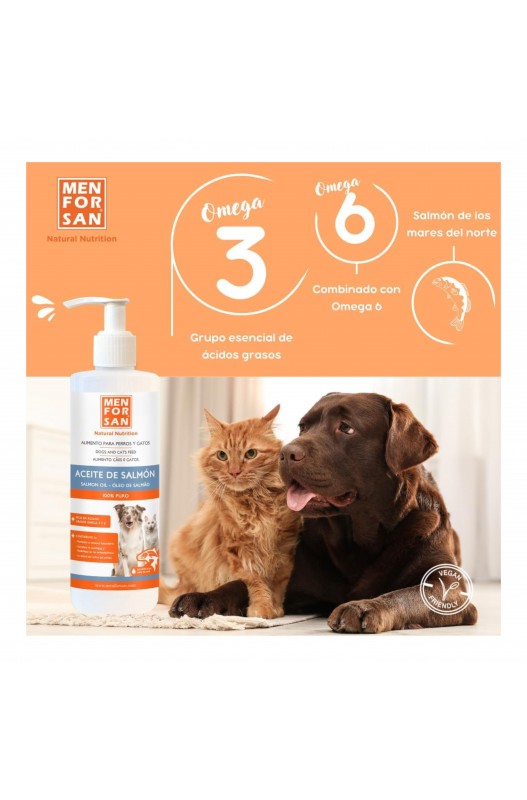 Aceite de salmón de primera calidad para perros y gatos. Enriquece la dieta diaria gracias a su alto contenido en ácidos grasos Omega-3 y Omega-6 . Estos ácidos grasos proporcionan brillo al pelaje , apoyan el sistema inmunológico y fortalecen las articulaciones y los huesos.