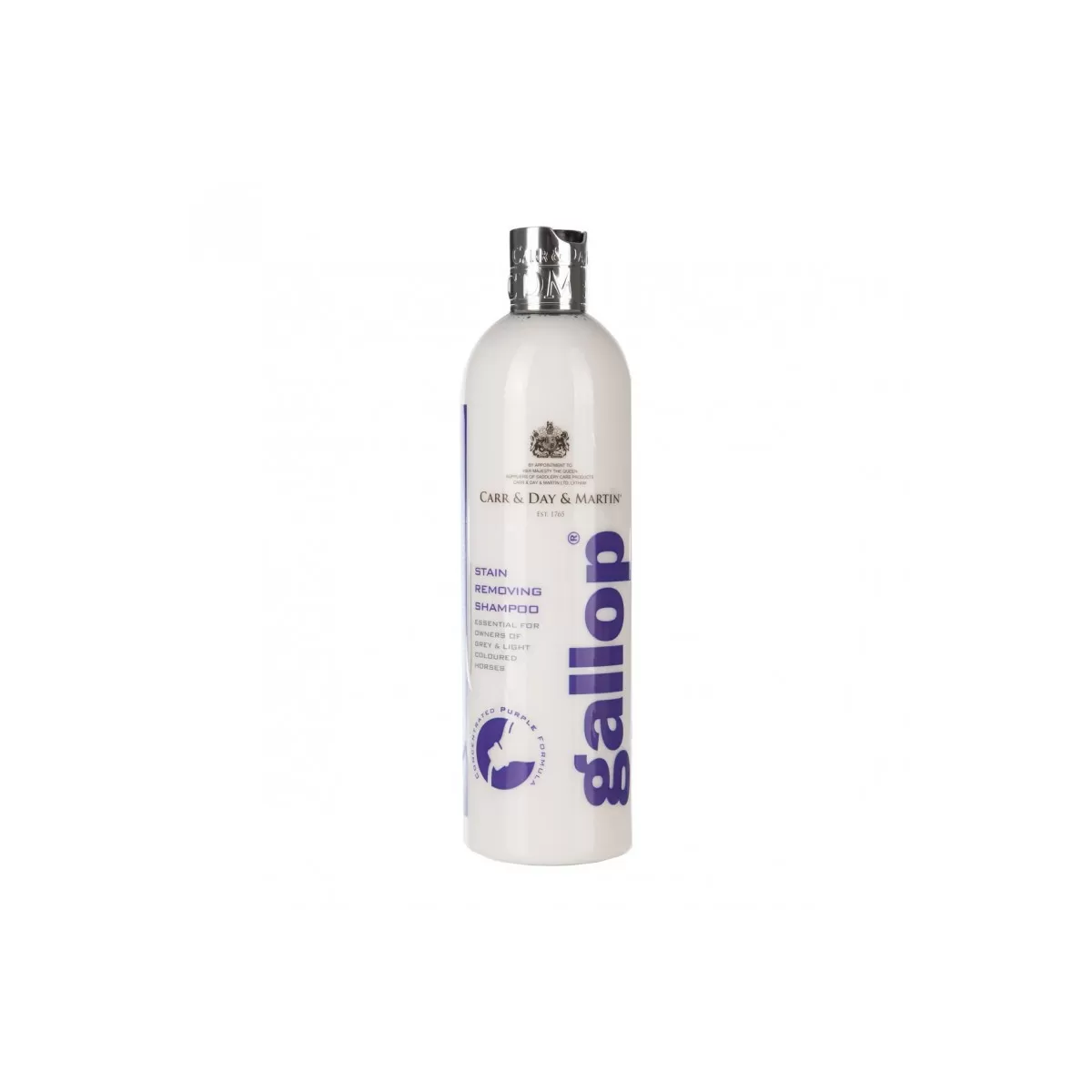 C&D GALLOP Champú Quita Manchas 500 ml es un champú de fórmula extra fuerte especialmente diseñado para caballos de color gris o claro.