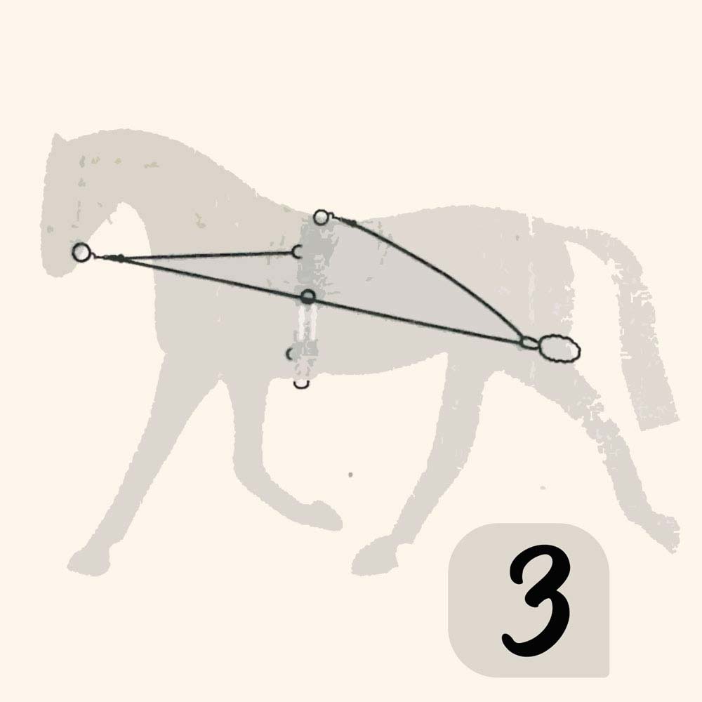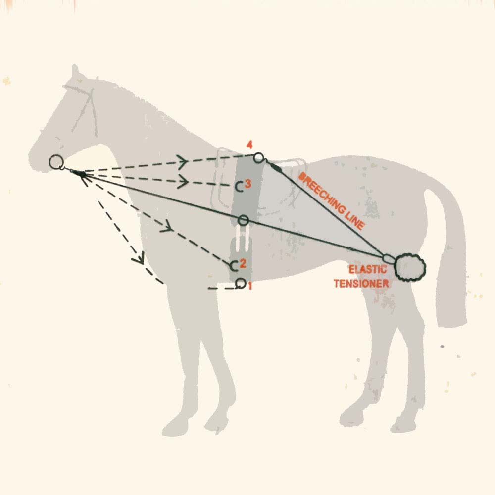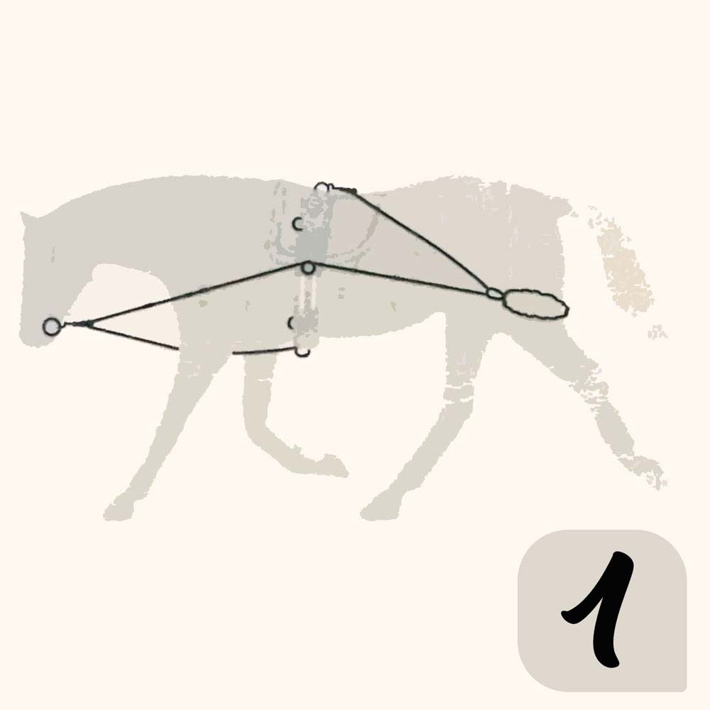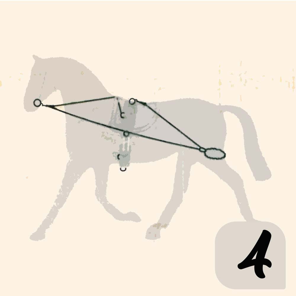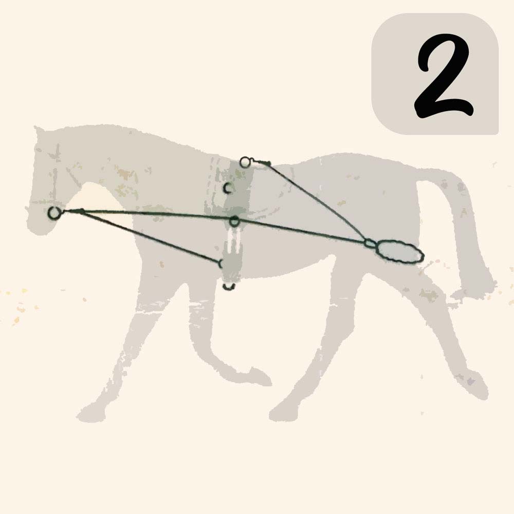 Esto impide al caballo el golpe de derecha y hace que coordine lo corvejones delantero. Conecte los extremos a la anilla número 2 (ver dibujo).