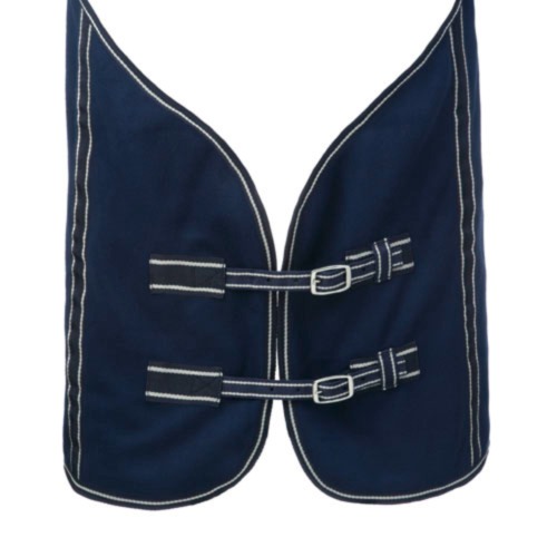 Manta polar con cinchuelos cruzados, cierre en el pecho y cordón en cola.