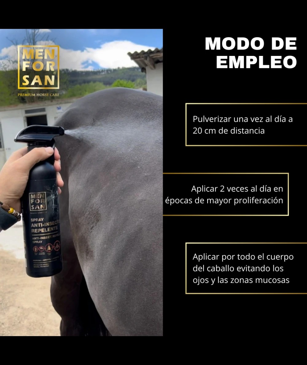 Aplicar 1 vez al día en caballos estabulados. En épocas de mayor proliferación de insectos y en caballos de exterior, pulverizar 2 veces por día en todo el cuerpo del caballo, evitando los ojos y mucosas, a una distancia de 20 centímetros.